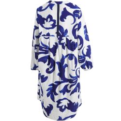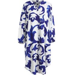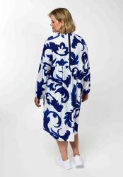 Anja kjolen er syet i en blød og let viskosekvalitet, der falder smukt omkring kroppen og giver en behagelig, afslappet pasform. Det markante grafiske print kombineret med den gennemknappede front og de lange ærmer med elastik gør kjolen nem at style – både alene som kjole eller åben over bukser og top.