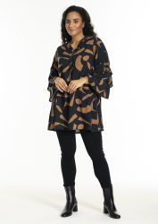 Smuk tunika fra Studio med lækkert print i sort og brun i 100% viskose med vilde, festlige ærmer. V-halsudskæring med læg samt lange ærmer med smock samt adskillige store flæser.