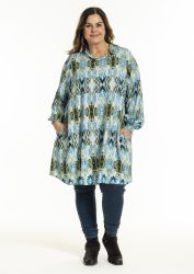 Smuk tunika med grønt print i bedste viskosekvalitet. A-formet med feminin løs krave og lange ærmer med smockede manchetter. Dekorativ dobbelt-lags fold på bagsiden. Tunikaen har sidelommer.